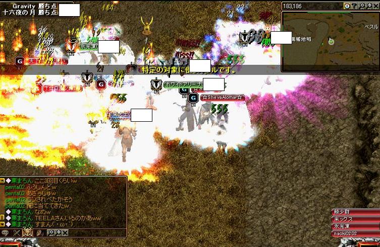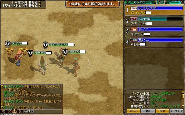 本日は期待の新戦力、ひだりがわさん(リトル)とホワイトのお友達アーチャ来希さんの十六夜初GVでしたよ!!十六夜も支援WIZ4名と火力も申し分ない布陣で勝利を期待できる11名もの大家族!!400×400の超広大なMAPを舞台に相手様も約10人PTの平均340Lv、top火力430台ということで序盤から衝突と同時に終始点の取り合いが展開されました^^サキュテイマさん、シフ、武道、アーチャ、WIZ数名、透明すぎるディスペ天使、ランサ、剣士、とMAP中央でがっぷりよつ!!