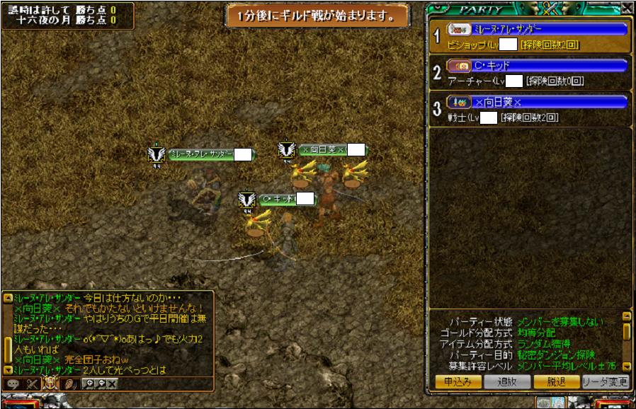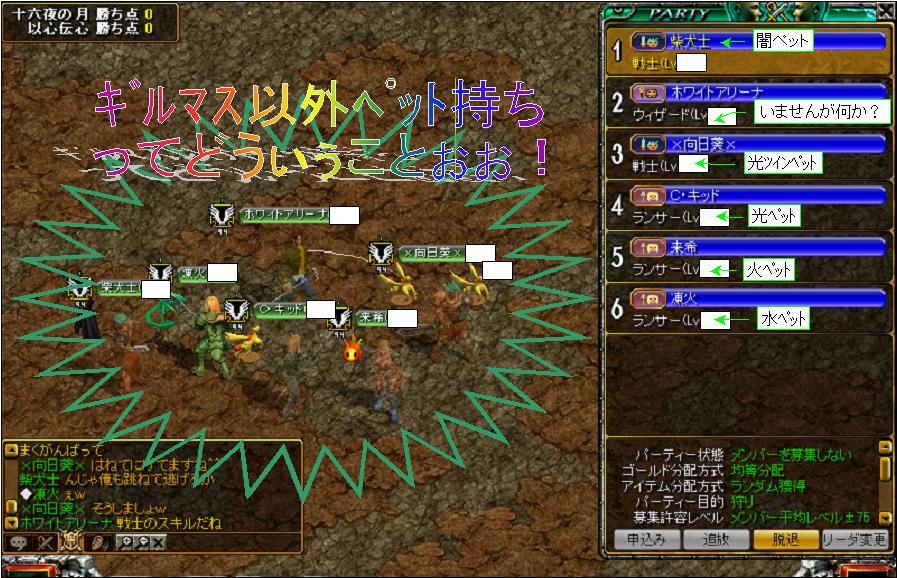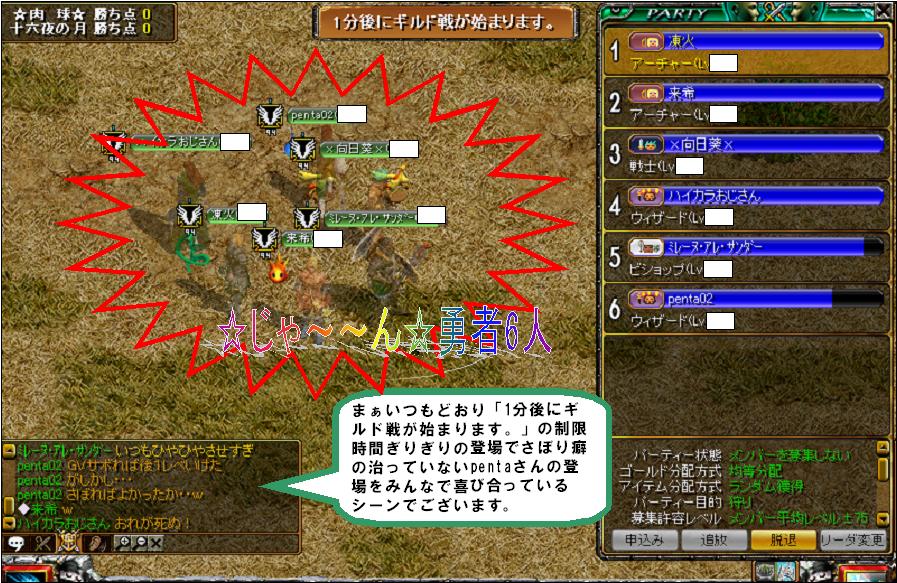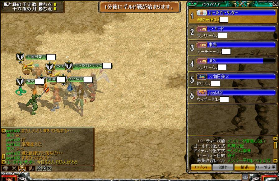なった様子。結構直前にギルド戦が急きょ決まったこともありお相手さまもメンバーの集まりが悪かったらしいですネッ>n<。まっ!うちは常連メンバーはいつもどおりの6人と言った感じでしたが。。。
