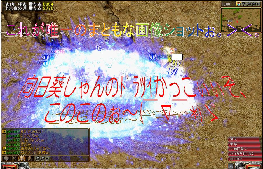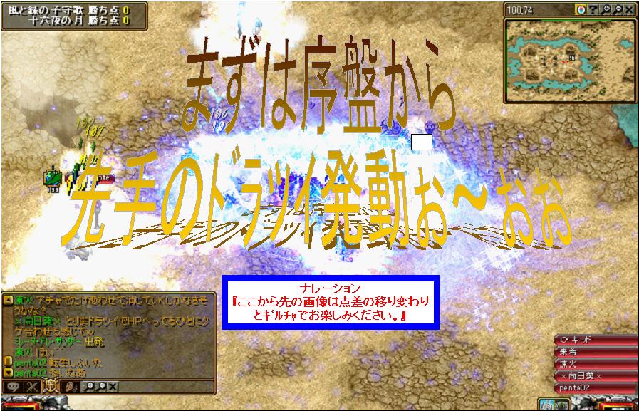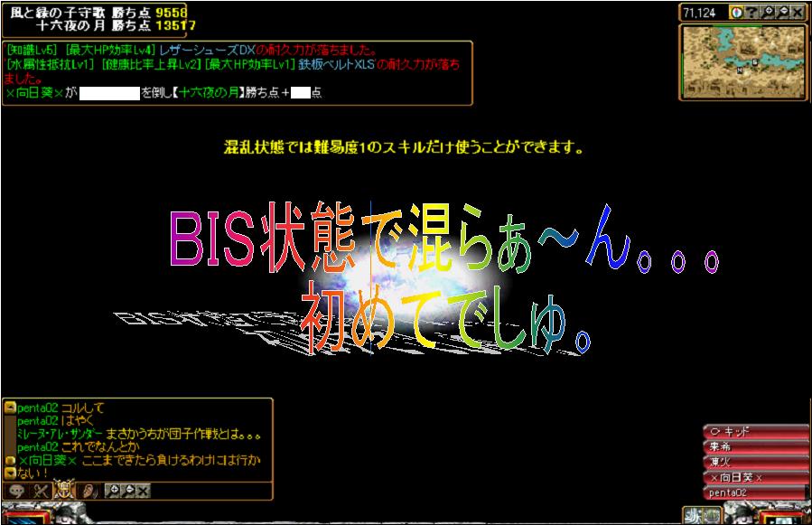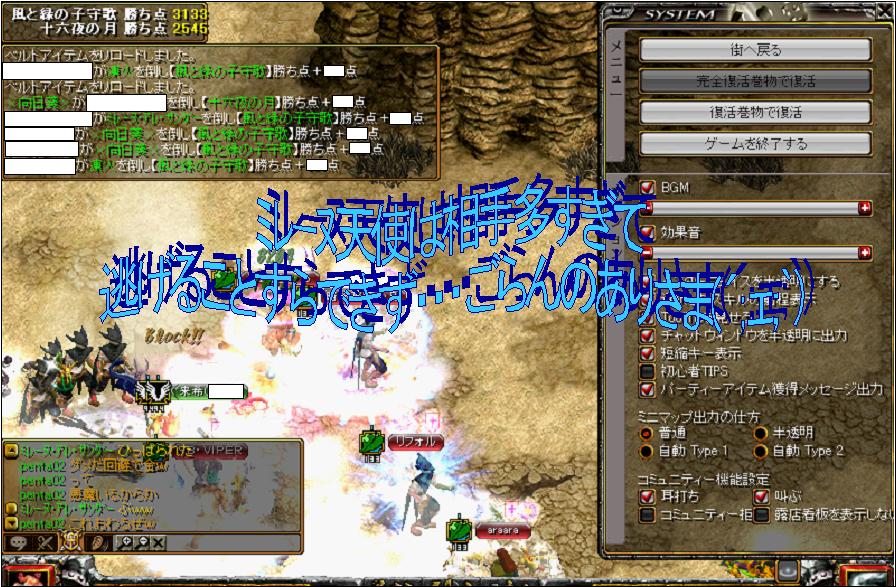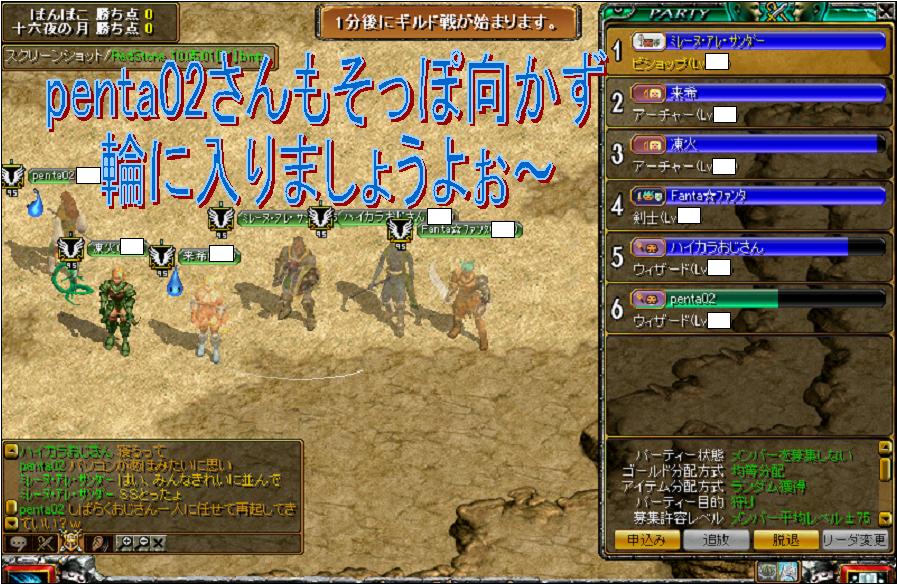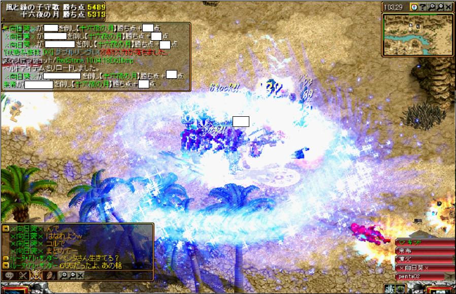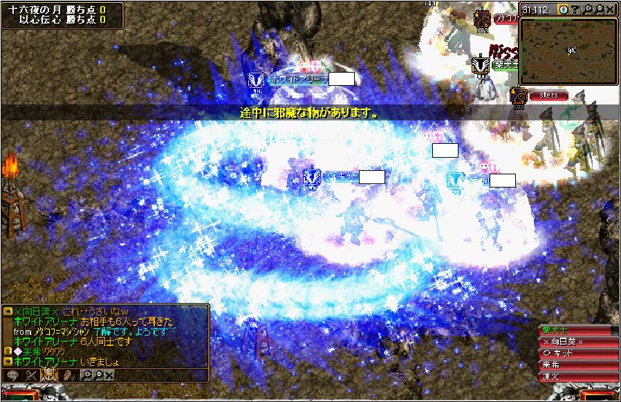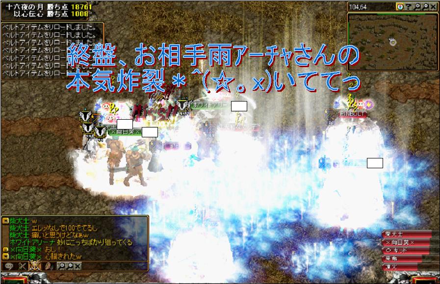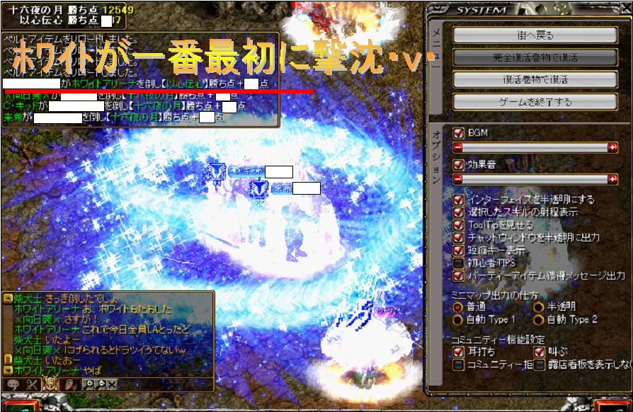 550台?WIZ、640台剣士、610台弓、霊術師の方はいませんでしたが火力Lvだけならすごぃ強くなってて交渉の時点で少し弱気になっていたホワイトです。ただBISさんの姿が対戦中見えなく、ふと相手の方が全員消えるとぃうことでコルBISがどこかに潜んでいた様子でしたね。開始早々まさかのpenta02さんはPC再起動でギルド戦開始して15分経ってやっと戻ってきましたぁ~おそっ^^;;半分終わってるとぃぅ・・・。序盤は相手の