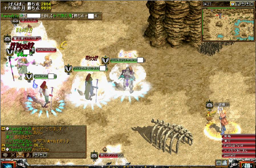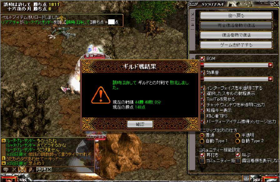見事敵を倒すという快挙もなしとげホワイトも万歳しましたヾ(@^▽^@)ノ ワーイ。十六夜で相手倒したのって2,3回目!貴重なんですょ。たまたま放った水鉄砲があたったみたいです。結果的にはBISなしのハンデになったけど次回再戦の際は是非お相手の本気で好勝負が期待できそうな気がしますよ。楽しみなギルド様が見つかってよかったぁ~。
