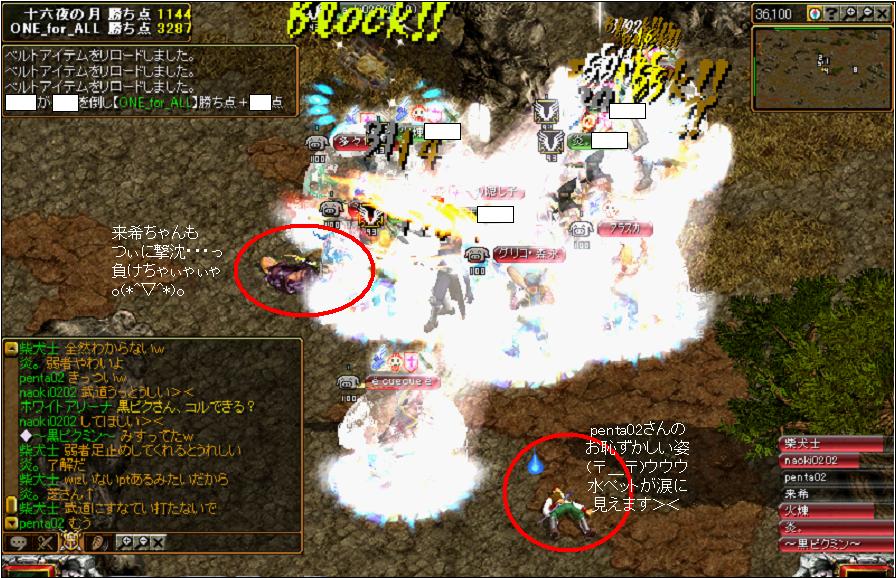 相手はうま~く固まってまとまって攻撃してきてますよ。途中相手の武道さんが戦場で自力復活を繰り返し・・・しかも5%復活巻き物ぽかったらしく柴犬さんに連続で点をあげてましたね><アリーナも心臓メテオしてたら倒してしまってました・v・あの武道さん、何を死に急ぐ・・・っ(笑2000点くらぃいただきましたぁ~☆⌒(*^-゜)v Thanks!!→→→→そして逆転!!O(≧▽≦)O ワーイ♪