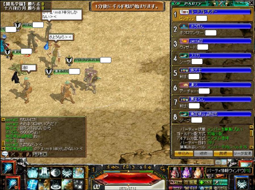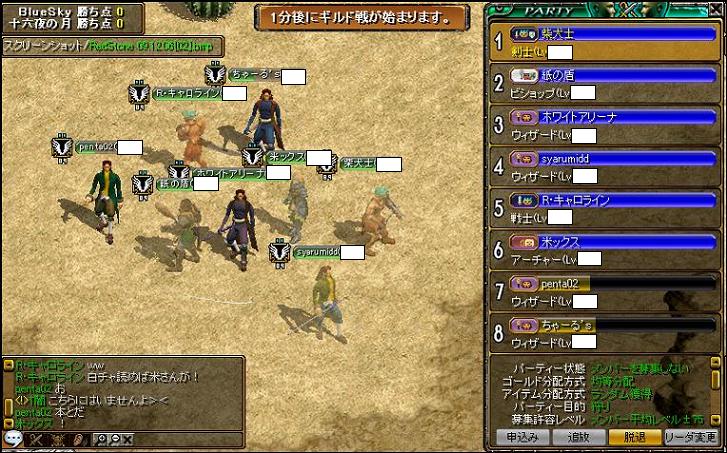 さてお相手は事前情報だとGv平均Lv400、top640台のWIZさん(相手マスター様)を中心に火力520台弓、510台雨弓が主力ですね。100Lv台~200Lv台も含めて10人程度の自称守りのギルド様。実際のところ9人だった様子で序盤から終始お互いに点の取れない展開ww守りが堅いというだけあって健康さんが多かったのかしら?