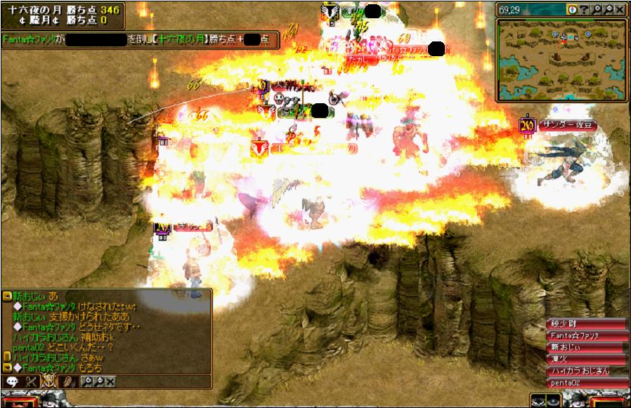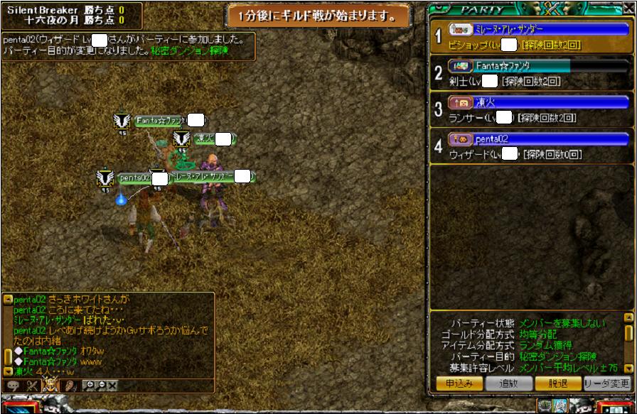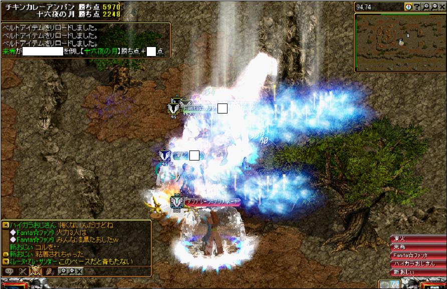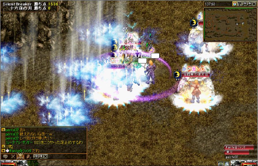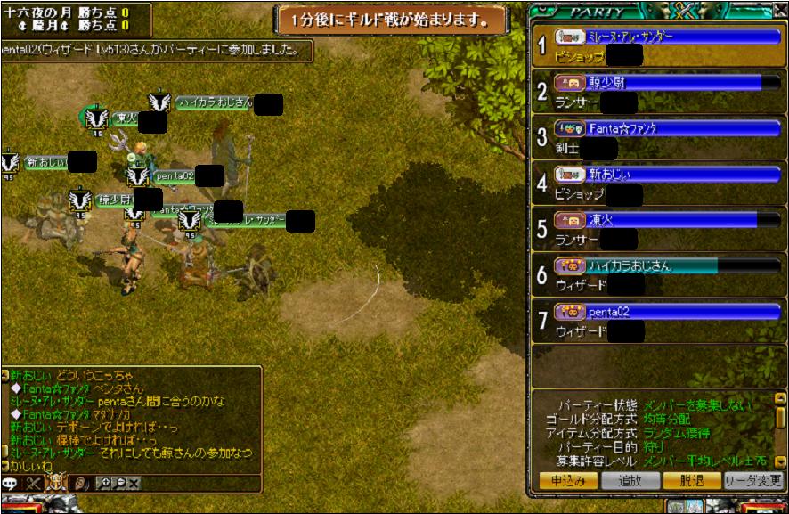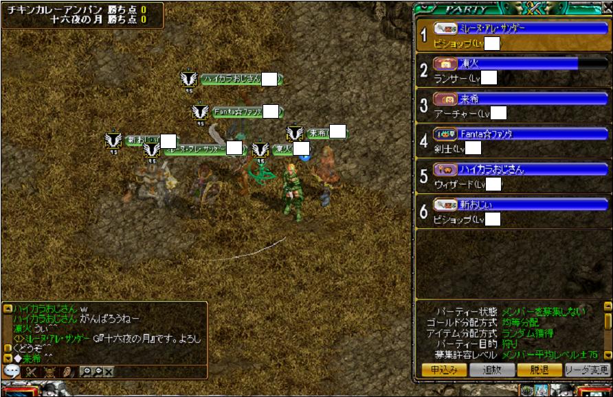 久しぶりの鯨少尉さんの参加で十六夜メンバー7人が集まりました。お相手も1PT満員くらぃの人数で武道、WIZ、火力ともレベルも人数もほぼ互角と思われます。ただ相手さん、BISなしでしたね。。。それにしても一人イタイイタイ剣士さんがヤバイ程痛かったです。HPの減り方も半端なくうちの支援陣も余裕なかった様子。終始目隠しの火雨が降り注いでましたが十六夜リードは序盤の10分まで。。。それ以降はずっとリードを許し倒し倒されての展開でしたが、最終的には火力のわずかな差で十六夜の敗北です。