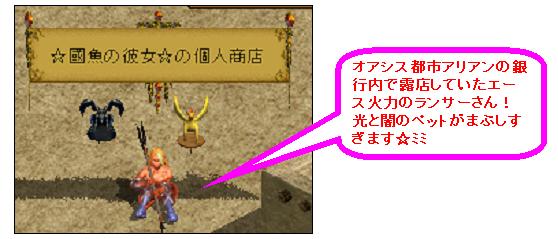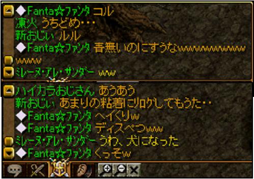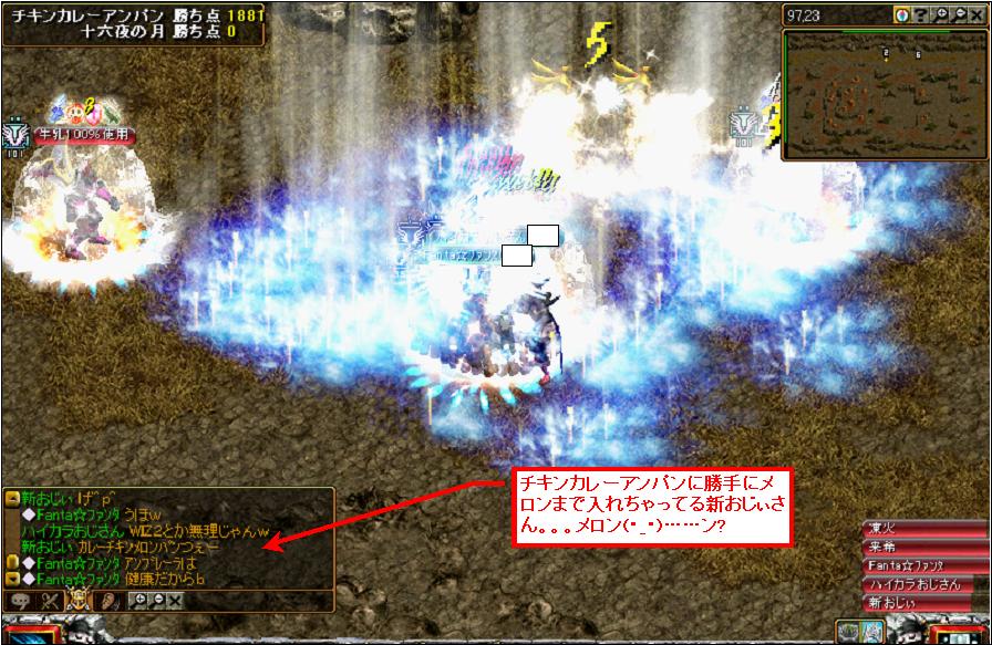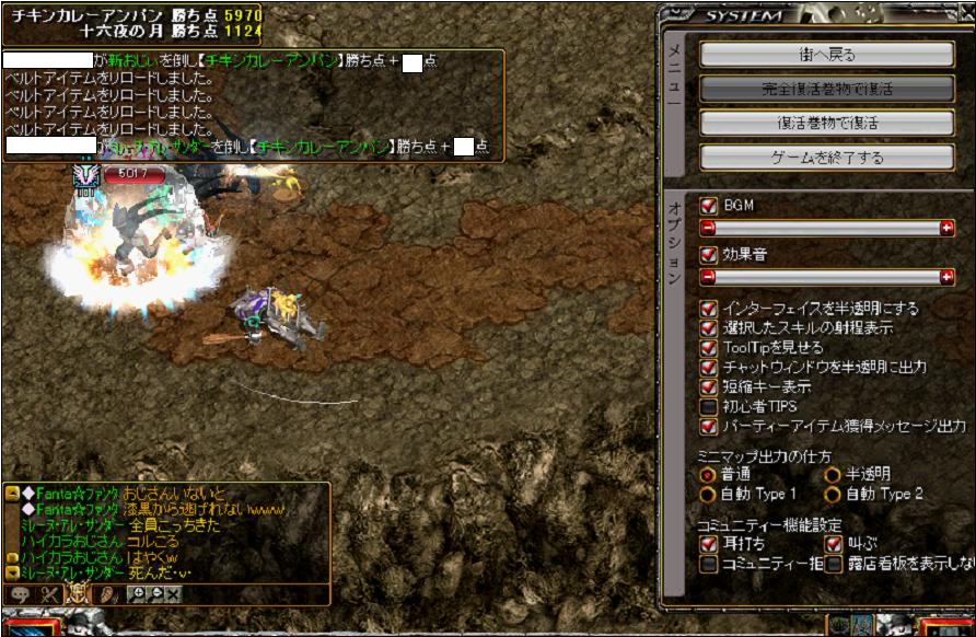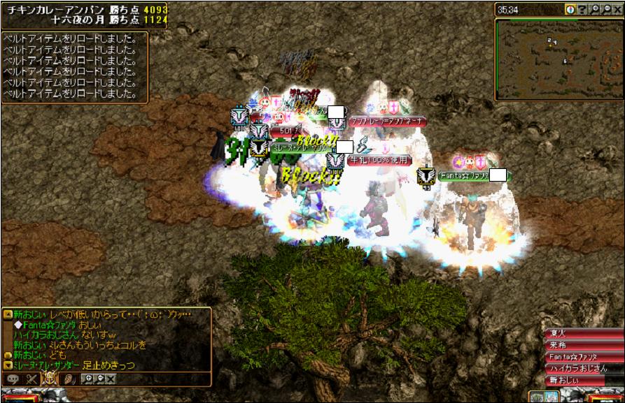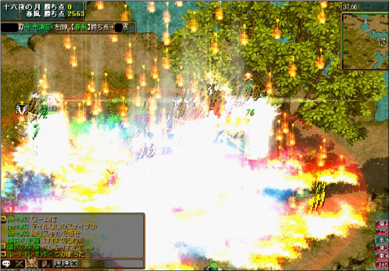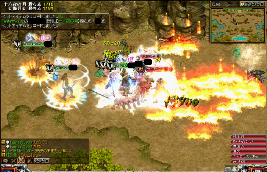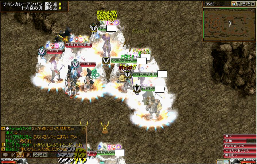 久しぶりの鯨少尉さんの参加で十六夜メンバー7人が集まりました。お相手も1PT満員くらぃの人数で武道、WIZ、火力ともレベルも人数もほぼ互角と思われます。ただ相手さん、BISなしでしたね。。。それにしても一人イタイイタイ剣士さんがヤバイ程痛かったです。HPの減り方も半端なくうちの支援陣も余裕なかった様子。終始目隠しの火雨が降り注いでましたが十六夜リードは序盤の10分まで。。。それ以降はずっとリードを許し倒し倒されての展開でしたが、最終的には火力のわずかな差で十六夜の敗北です。